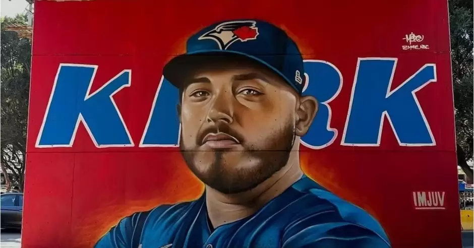 El apellido Kirk y el rostro del estelar de los Blue Jays con un fondo rojo cubren una pared de su natal Baja California.