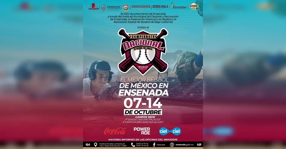 ENSENADA.- Un total de 12 equipos de diferentes entidades del país, se han inscrito al Campeonato Nacional de Béisbol Primera Fuerza Ensenada 2023, el cual se llevará a cabo en la ciudad, del 7 al 14 de octubre dentro del estadio "Antonio Palacios" y el campo "Rubén Sánchez Legaspy".