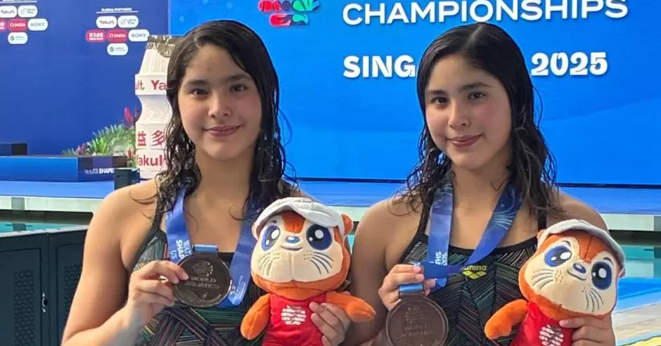 México.- Este martes, la dupla mexicana de las gemelas Lía y Mía Cueva subieron al podio en el Campeonato Mundial de Deportes Acuáticos Singapur 2025 al ganar la presea de bronce.