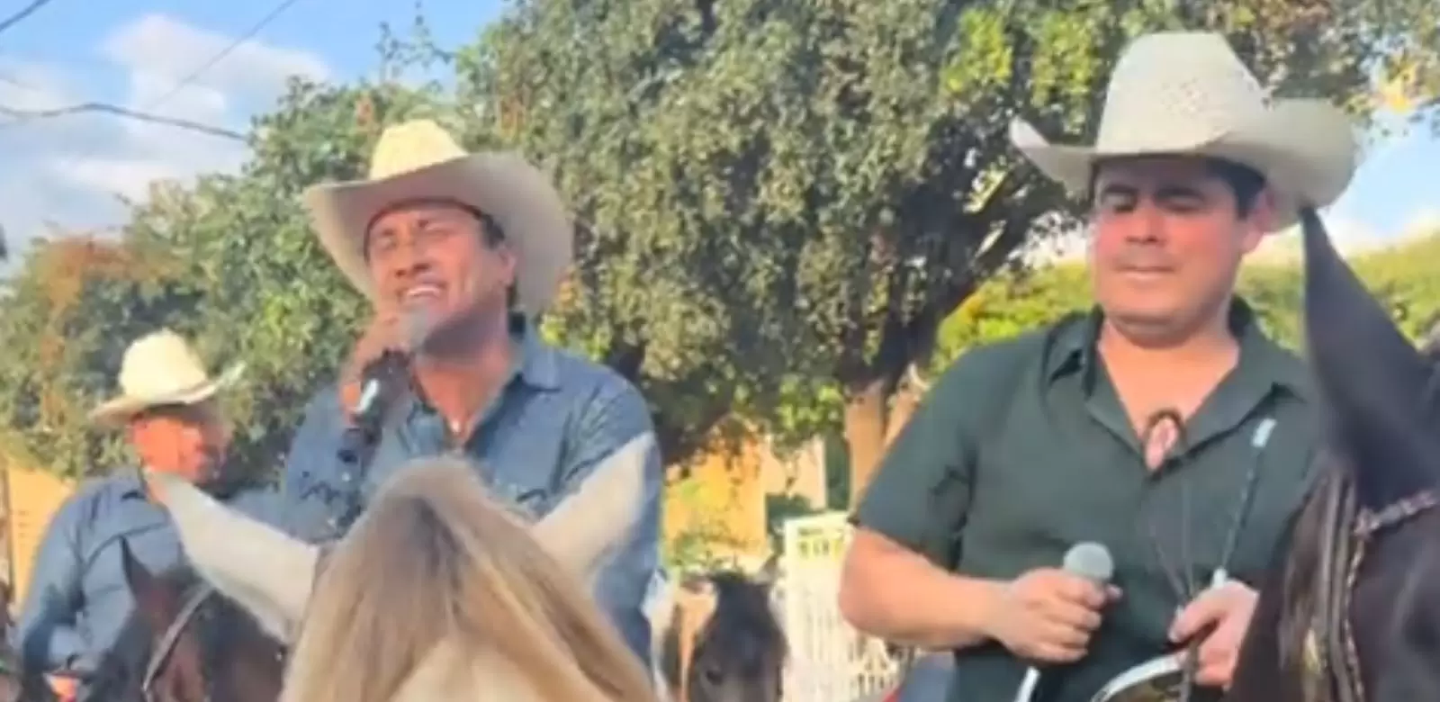 En videos que circulan ampliamente en redes sociales, se puede ver a los dos intérpretes montados a caballo, cantando algunos de sus éxitos y saludando a los presentes desde el trayecto.