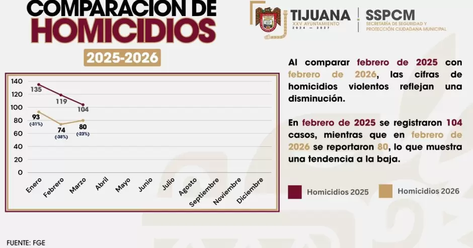 TIJUANA.- Las acciones coordinadas entre la Secretaría de Seguridad y Protección Ciudadana Municipal (SSPCM) y las autoridades federales y estatales continúan mostrando resultados positivos en la recuperación de la paz y la tranquilidad en Tijuana. Durante el mes de marzo se registró una reducción significativa en los homicidios dolosos, con un total de 80 fallecimientos, cifra inferior a los 104 reportados en el mismo periodo del año anterior.