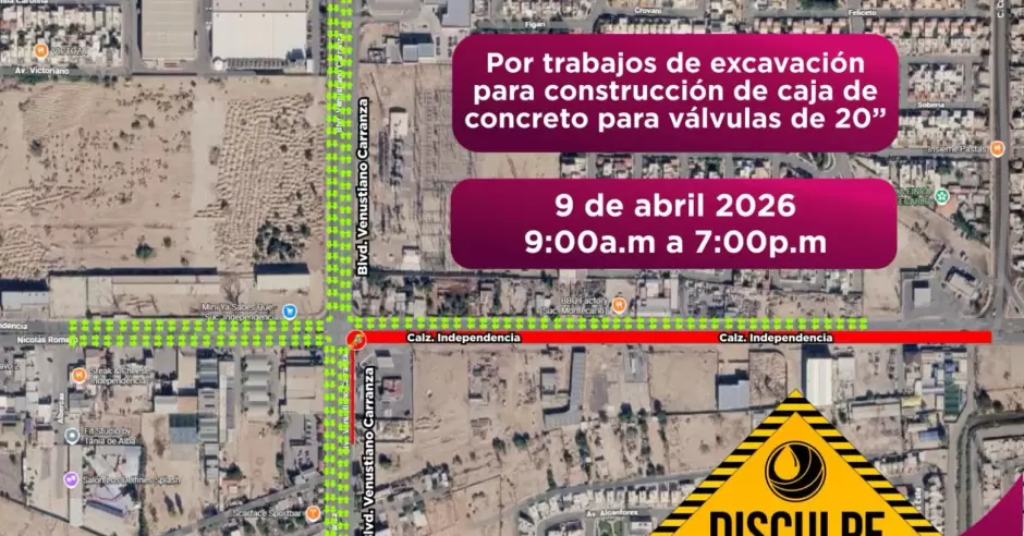 Asimismo, la CESPM anunció el cierre total en el sentido poniente-oriente de la calzada Independencia, en el tramo comprendido entre bulevar Carranza y calle Cuarta, incluyendo el acceso de Carranza hacia Independencia. Este cierre se mantendrá de 9:00 a 19:00 horas debido a trabajos de excavación para la construcción de una caja de concreto destinada a válvulas de 20 pulgadas.