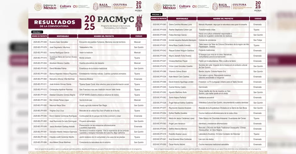 MEXICALI. - Con el propósito de impulsar el desarrollo de proyectos culturales comunitarios que promuevan la creatividad, la autogestión y la investigación local, el Instituto de Servicios Culturales de Baja California (ISCBC) dio a conocer que resultaron beneficiados un total de 44 proyectos, resultado de la convocatoria del Programa de Apoyos a las Culturas Municipales y Comunitarias (PACMyC*) 2025.