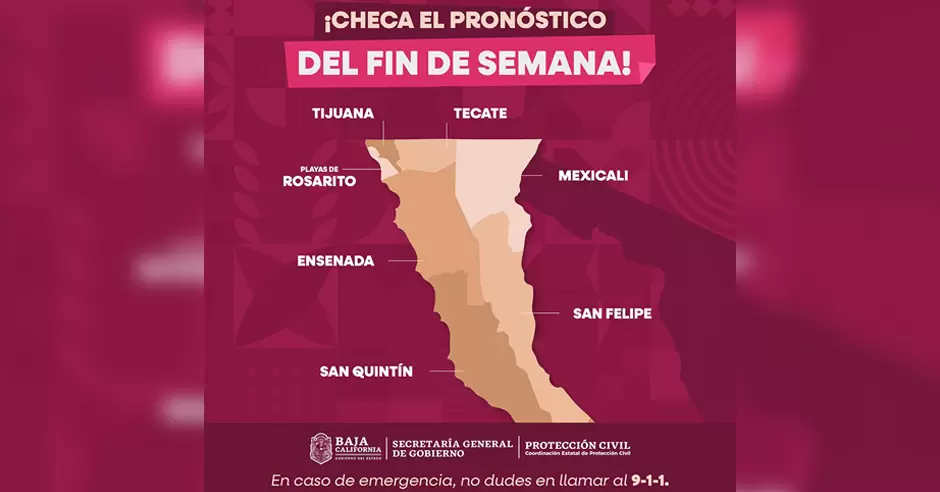 TIJUANA.- La Coordinación Estatal de Protección Civil (CEPC) informa que, de acuerdo con el pronóstico emitido por el Servicio Meteorológico Nacional, durante este fin de semana se presentarán lluvias dispersas, vientos y un descenso gradual en las temperaturas en diferentes regiones del estado.