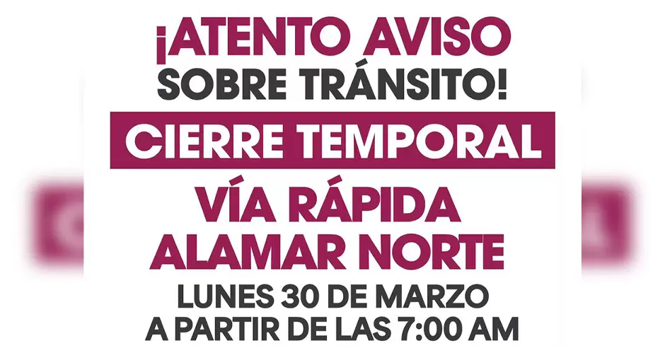 Tijuana.- El lunes 30 de marzo a partir de las 7:00 horas, el Gobierno de la Ciudad, suspenderá la circulación vehicular temporal de un tramo de la Vía Alamar Norte, como parte de las acciones de rehabilitación de la infraestructura pluvial de la zona, tal como lo ha instruido el presidente municipal, Ismael Burgueño Ruiz.
