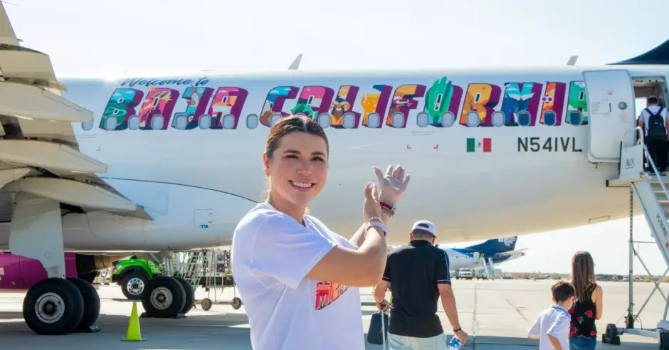 La gobernadora asistió a la puesta en marcha de un avión rotulado con la campaña Welcome to Baja, de la empresa Volaris