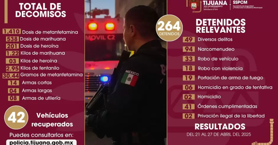 Tijuana.- Como parte de los resultados operativos que ha obtenido la Secretaría de Seguridad y Protección Ciudadana Municipal (SSPM), durante la semana del 21 al 27 de abril, se logró asegurar a un total de 264 personas.