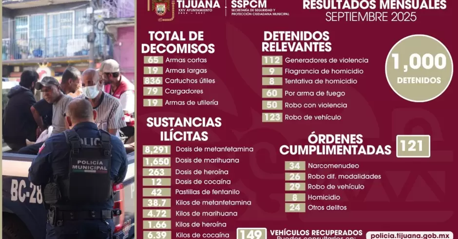 Los resultados obtenidos son producto de los operativos permanentes de la Policía Municipal de Tijuana, que incluyen recorridos preventivos en distintos puntos de la ciudad, así como la aplicación de herramientas tecnológicas y acciones de inteligencia policial. Estas estrategias han permitido detectar de manera oportuna la comisión de delitos, reforzar la vigilancia en puntos de riesgo y garantizar una respuesta más efectiva en la protección de la ciudadanía.