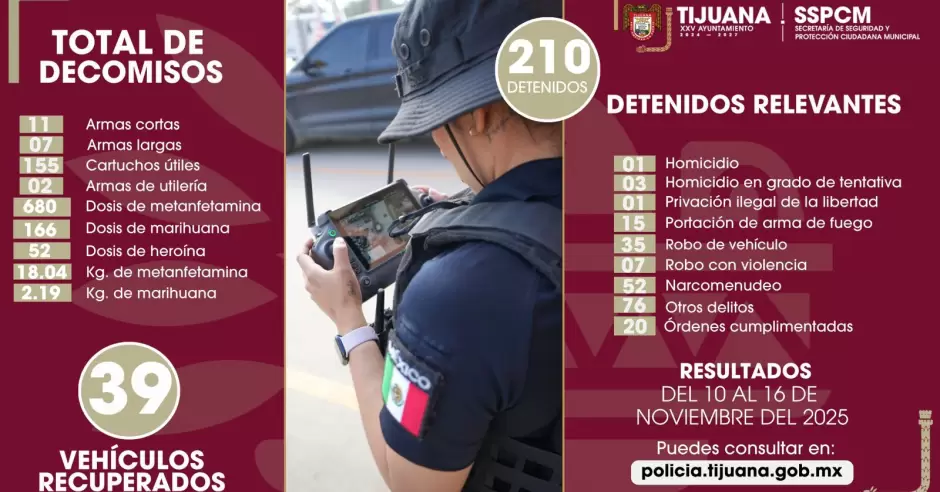 Los resultados obtenidos por la Policía Municipal de Tijuana durante la semana del 10 al 16 de noviembre, reflejan un esfuerzo constante y coordinado en pro de la seguridad pública. La implementación de estrategias efectivas y el trabajo conjunto con la comunidad son fundamentales para lograr un entorno seguro y pacífico, donde cada ciudadano pueda vivir sin temor y contribuir al progreso de nuestra ciudad. La SSPCM continuará su labor con determinación y enfoque en la justicia, buscando siempre el bienestar de las y los tijuanenses.