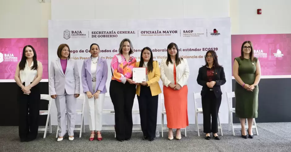 TIJUANA.- Bajo la Instrucción de la gobernadora de Baja California, Marina del Pilar Avila Olmeda, de fortalecer la atención especializada y sensible a mujeres víctimas de violencia de género, se llevó a cabo la entrega de certificados a personas servidoras públicas del Poder Ejecutivo, Poder Legislativo, Poder Judicial y Ayuntamientos, que concluyeron con éxito el curso de capacitación con duración de 40 horas y obtuvieron la certificación con valor curricular en el Estándar de Competencia EC0539, "Atención Presencial de Primer Contacto a Mujeres Víctimas de Violencia de Género" .