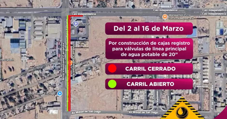 Mexicali. — La Comisión Estatal de Servicios Públicos de Mexicali (CESPM) informó sobre un cierre parcial de vialidad en el Bulevar Venustiano Carranza, en el tramo comprendido entre la avenida Misión de San Diego y la Calzada Independencia, como parte de trabajos de infraestructura hidráulica.