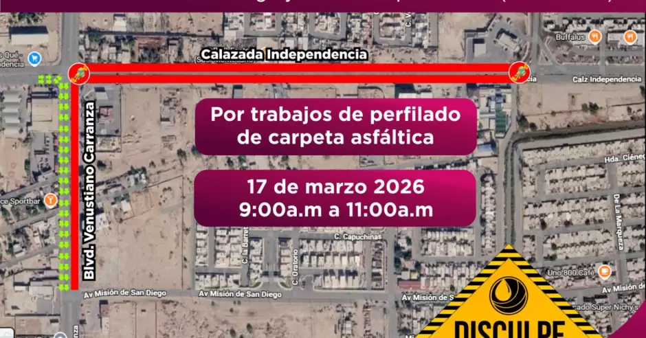 Las labores se realizarán el 17 de marzo de 9:00 a 11:00 de la mañana en Calzada Independencia y un tramo del bulevar Carranza.