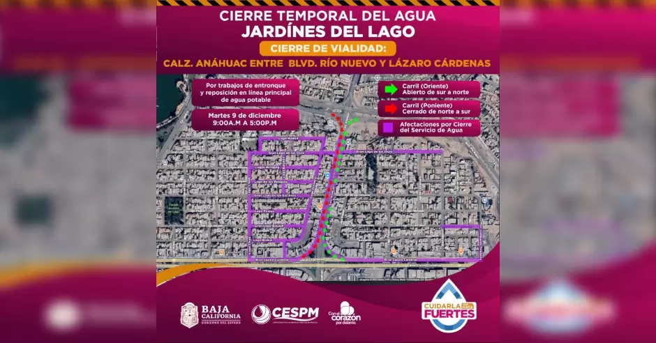 MEXICALI.- La Comisión Estatal de Servicios Públicos de Mexicali (CESPM) informó que a partir de mañana martes 9 de diciembre se llevarán a cabo trabajos de entronque y reposición en la línea principal de agua potable en la zona de Jardines del Lago, lo que requerirá cierres temporales de vialidad y afectaciones en el suministro del servicio.