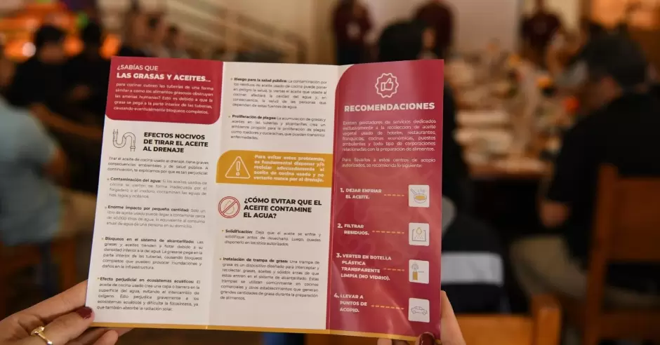 Durante la plática se brindaron recomendaciones puntuales a los establecimientos, entre ellas: Instalar y dar mantenimiento regular a trampas e interceptores de grasa, capacitar al personal en su uso y operación, y recolectar el aceite usado en recipientes plásticos transparentes y herméticos para entregarlo a empresas autorizadas.
