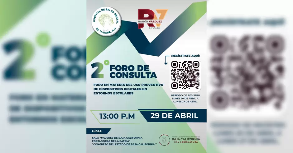 MEXICALI.- El Congreso del Estado de Baja California, en coordinación con el Hospital de Salud Mental de Tijuana, A.C., invita a la comunidad educativa y a la ciudadanía en general a participar en el 2° Foro de Consulta en materia del uso preventivo de dispositivos digitales en entornos escolares, que se celebrará mañana, miércoles 29 de abril, a las 13:00 horas, en la Sala Mujeres de Baja California Forjadoras de la Patria.