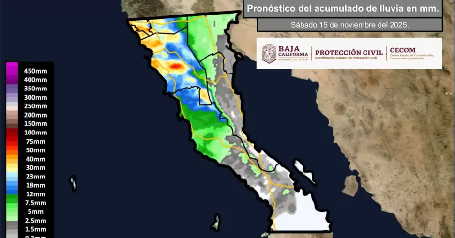 De acuerdo con los pronósticos del Servicio Meteorológico Nacional (SMN) de la Comisión Nacional del Agua (Conagua), en Baja California se ha incrementado la probabilidad de lluvias a muy fuertes, especialmente para el sábado 15 de noviembre, cuando se esperan las precipitaciones de mayor intensidad. Estas condiciones podrían estar acompañadas de rachas de viento de 60 a 70 kilómetros por hora, descenso en las temperaturas y posible presencia de descargas eléctricas.