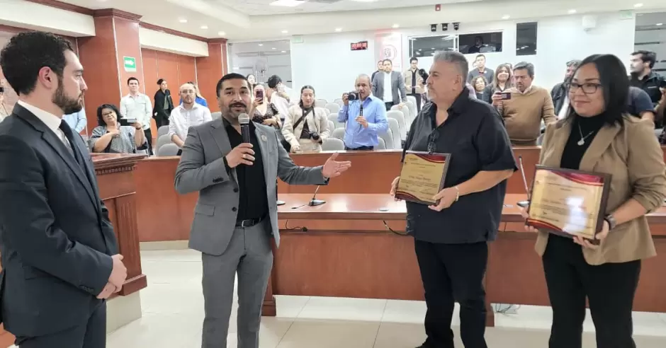 A solicitud del diputado Ramón Vázquez, el Congreso del Estado entregó reconocimientos a la directora Zayda Ludivina Jiménez Juárez, con 17 años de servicio, y al maestro Rodrigo Venegas Ramírez, con 35 años de trayectoria, ambos pertenecientes a la Escuela Primaria Benito Juárez.
