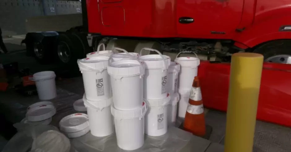 Durante la inspección, los agentes extrajeron 29 cubetas de cinco galones con el líquido, que tras pruebas de campo dio positivo a metanfetamina, con un peso total de 944 libras.