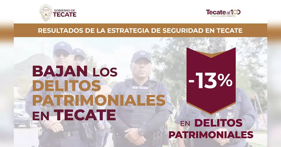 Tecate.- Como resultado de una estrategia integral en materia de seguridad pública, los delitos patrimoniales en Tecate registraron una reducción del 13 %, de acuerdo con cifras oficiales de la Secretaría de Seguridad Ciudadana del Estado de Baja California, reflejando avances concretos en la protección del patrimonio de las familias tecatenses.