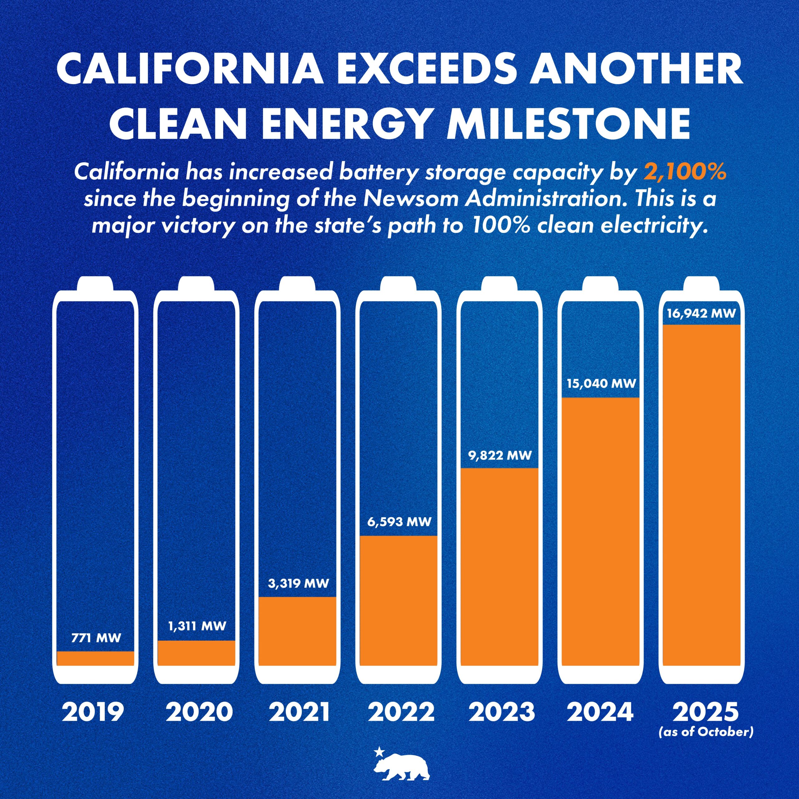 Los sistemas de baterías ahora proporcionan capacidad suficiente para cubrir el equivalente a aproximadamente una cuarta parte de la demanda máxima récord de California durante varias horas. La rápida expansión del almacenamiento de energía en baterías de California es fundamental para su estrategia de alcanzar el objetivo de electricidad 100% limpia para 2045. La energía renovable ya suministra casi el 67% de las ventas minoristas de electricidad en el estado, y California continúa desmantelando centrales de combustibles fósiles y eliminará la energía de carbón de su matriz energética para finales de este año. El Operador del Sistema Independiente de California (CAISO), que abastece a aproximadamente el 80% de los consumidores de electricidad del estado, ha cubierto, en promedio, la demanda con energía 100% limpia durante casi seis horas diarias en lo que va del año.