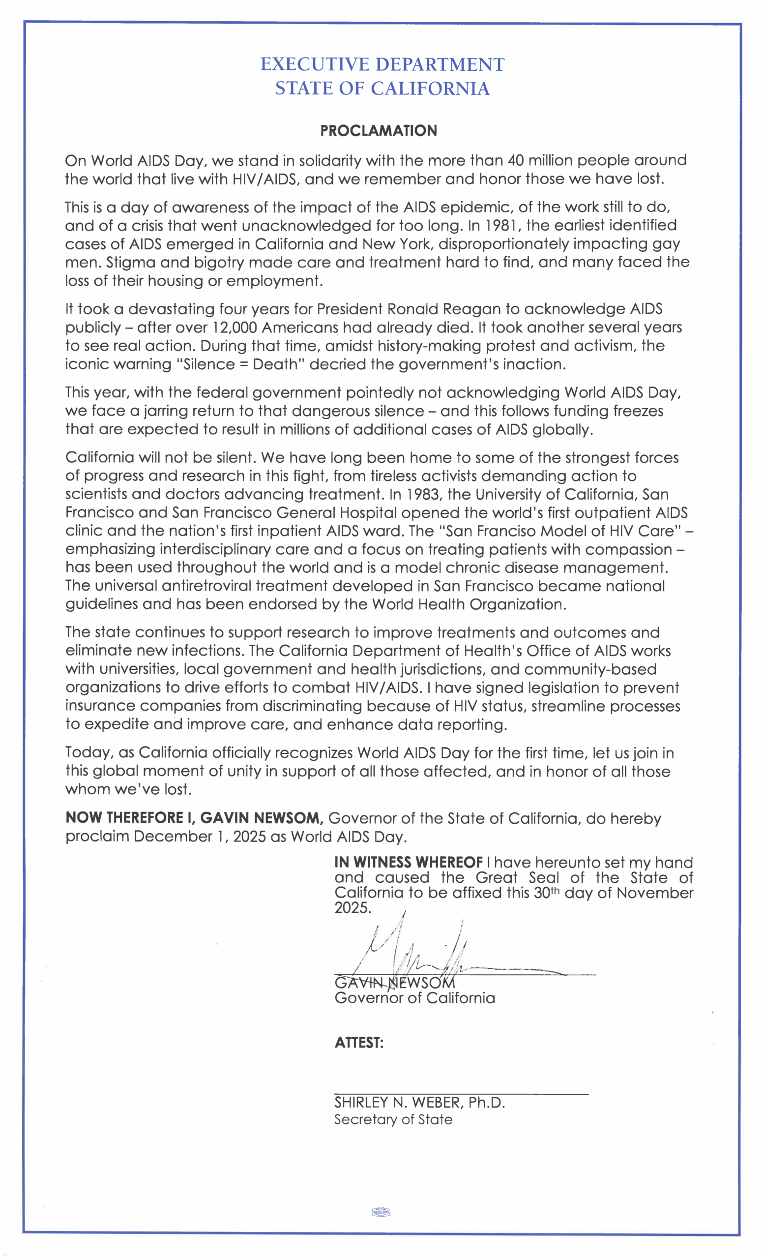 POR TANTO, YO, GAVIN NEWSOM, Gobernador del Estado de California, por la presente proclamo el 1 de diciembre de 2025 como Día Mundial del SIDA.