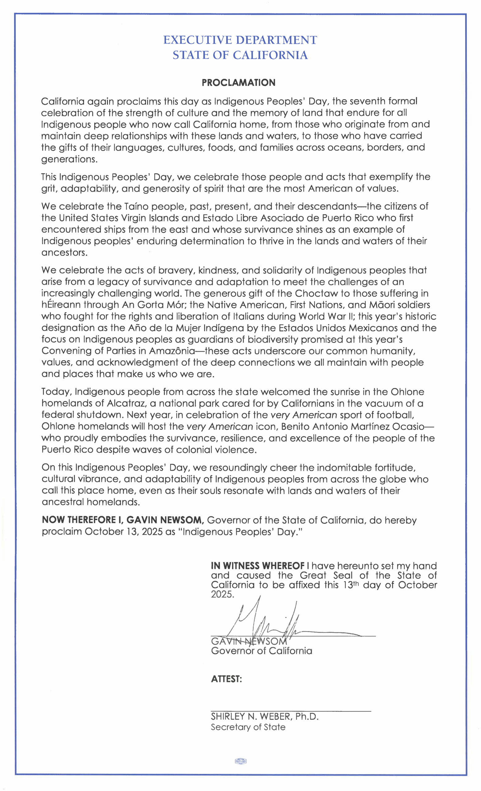 AHORA POR TANTO YO, GAVIN NEWSOM, Gobernador del Estado de California, por la presente proclamo el 13 de octubre de 2025 como el "Día de los Pueblos Indígenas".