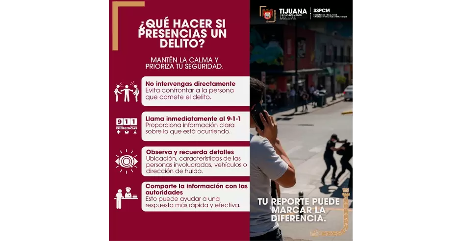 TIJUANA.- Con el objetivo de fomentar la participación ciudadana y fortalecer la prevención del delito, la Secretaría de Seguridad y Protección Ciudadana Municipal (SSPCM) exhorta a la población a mantener la calma y priorizar su seguridad en caso de presenciar la comisión de algún delito.