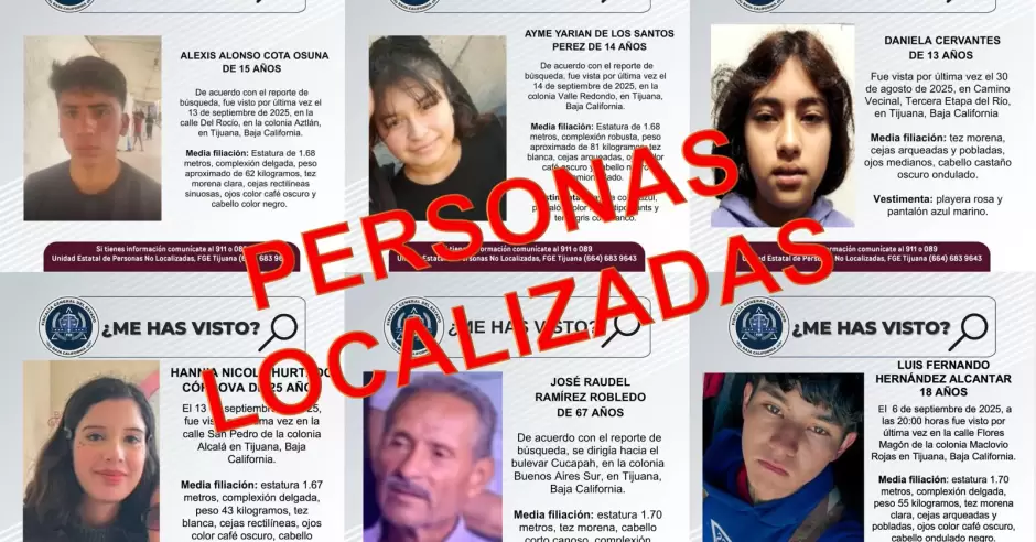 Las personas localizadas son: Alexis Alonso Cota Osuna de 15 años, Ayme Yarian de los Santos Pérez de 14 años, Daniela Cervantes de 13 años, Hannia Nicole Hurtado Córdova de 25 años, José Raudel Ramírez Robledo de 67 años, Luis Fernando Hernández Alcantar de 18 años, y Rey Gabriel González Rosales de 25 años de edad.