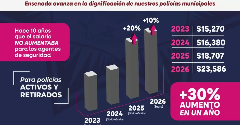 Ensenada.- Como parte del compromiso permanente con la dignificación policial, el Gobierno de Ensenada reflejó a partir de la presente catorcena mejoras sustanciales en las condiciones laborales de las y los integrantes de la Dirección de Seguridad Pública Municipal (DSPM), destacando un aumento salarial acumulado del 30 por ciento en menos de un año, un hecho histórico que pone fin a más de una década sin incrementos de esta magnitud.