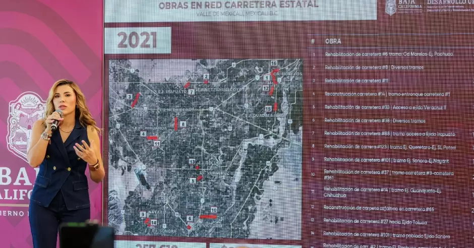 La mandataria destacó que, entre 2021 y 2025, en el Valle de Mexicali se han rehabilitado más de 605 mil metros cuadrados de carreteras, con una inversión superior a los 315 millones de pesos, beneficiando a miles de familias en zonas agrícolas y ejidales. Este monto es adicional a las mega obras impulsadas a través del programa RESPIRA.