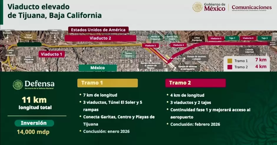 Asimismo, se detalló que el tramo dos contempló cuatro kilómetros adicionales, así como tres viaductos y dos tajos, con el objetivo de dar continuidad a la vialidad y mejorar el acceso al aeropuerto de Tijuana. De acuerdo con la información oficial, la finalización de este segundo tramo fue prevista para febrero de 2026.