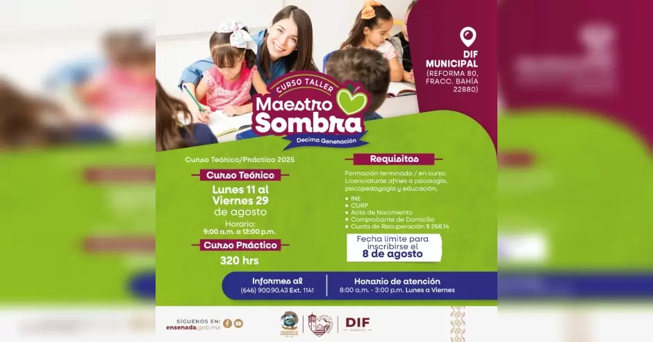 ENSENADA.- El Sistema para el Desarrollo Integral de la Familia (DIF) Municipal ha abierto las inscripciones para la décima edición del curso-taller "Maestro Sombra", con el propósito de capacitar a personas interesadas en brindar acompañamiento educativo a estudiantes con neurodivergencia dentro del aula.