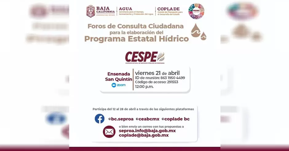 El foro consultivo se llevará a cabo vía Zoom, a las 12:00 horas, con la participación de autoridades del Comité de Planeación para el Desarrollo del Estado (COPLADE), Comisión Estatal del Agua (CEA), SEPROA y CESPE, esperando contar con la colaboración de la ciudadanía de Ensenada y San Quintín.
