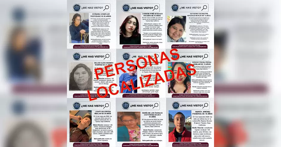 Tijuana.- La Fiscalía General del Estado (FGE) informó la localización de nueve personas que contaban con reporte de desaparición en el municipio de Tijuana, entre ellas tres menores de edad.