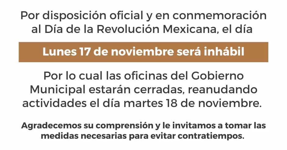 Tecate.- El Gobierno de Tecate informa a la ciudadanía que, de acuerdo con lo establecido en la Ley del Servicio Civil de los Trabajadores al Servicio de los Poderes del Estado y Municipios de Baja California, así como en las Condiciones Generales de Trabajo vigentes, el próximo lunes 17 de noviembre será considerado día inhábil para todo el personal municipal, con motivo de la conmemoración del 20 de noviembre (Revolución Mexicana).