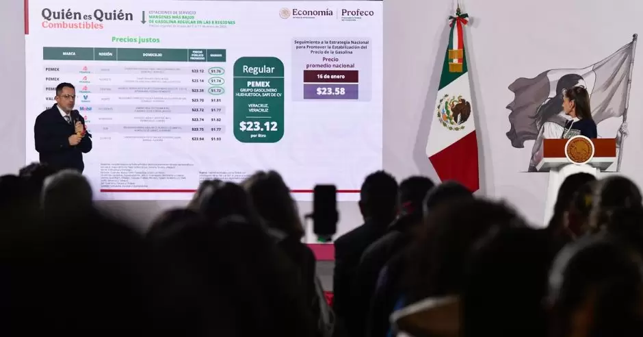 Durante su participación en Palacio Nacional, Escalante Ruiz detalló que el precio promedio nacional del litro de gasolina regular se ubica en 23.58 pesos, como parte de la estrategia para la estabilización del combustible.