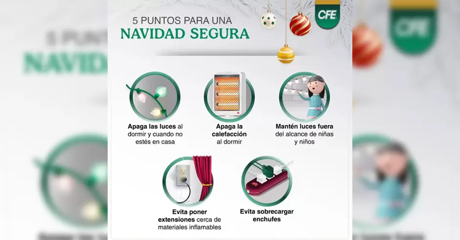 Los riesgos más frecuentes durante la temporada son incendios ocasionados por cortocircuitos o por el uso inadecuado de adornos, así como accidentes por contacto eléctrico. Para prevenirlos, es fundamental que todas las luces y accesorios eléctricos cuenten con el sello de la NOM (Norma Oficial Mexicana), que garantiza su seguridad y calidad. La CFE recomienda desconectar las luces interiores y exteriores antes de irse a dormir y al salir de casa; igualmente en la salida del trabajo y cierre de negocios, para prevenir un sobrecalentamiento y corto circuito si permanecen constantemente encendidas, además de que se consume más energía.