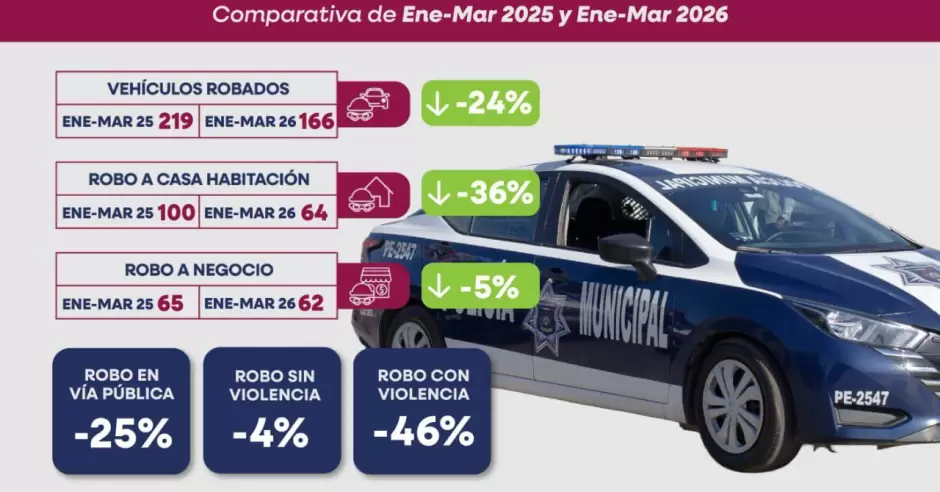 Ensenada.- La Dirección de Seguridad Pública Municipal (DSPM) informa que, como resultado de las acciones operativas y preventivas implementadas en el municipio, los robos en vía pública con violencia registraron una disminución del 46 por ciento durante el primer trimestre de 2026, en comparación con el mismo periodo del año anterior.