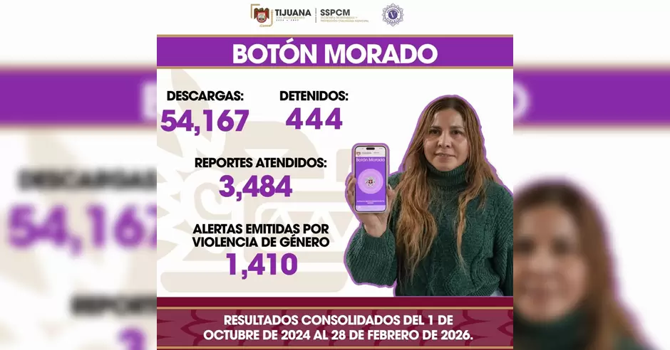 Como parte de estas acciones, del 1 de octubre de 2024 al 28 de febrero de 2026, se han registrado 54 mil 167 descargas de la aplicación "Botón Morado", mecanismo diseñado para brindar auxilio inmediato a mujeres que se encuentren en una situación de riesgo.