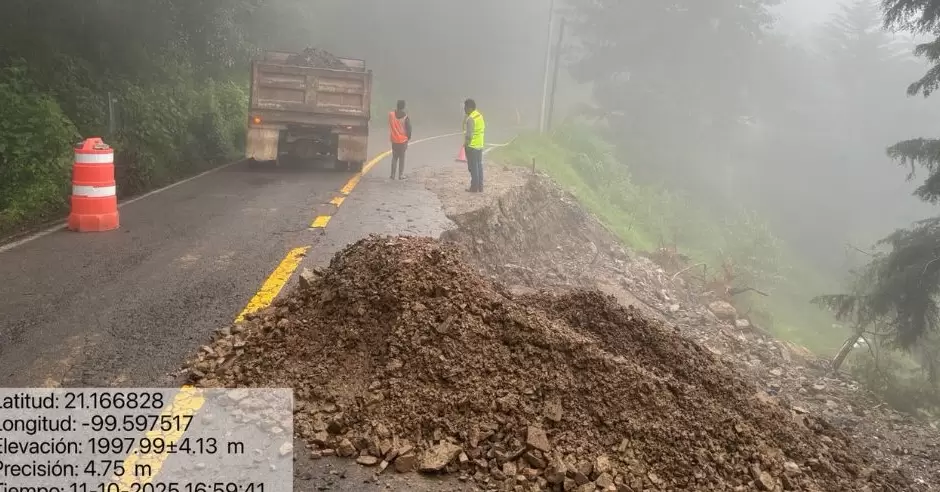 En Querétaro, las lluvias causaron siete interrupciones en las carreteras 120 y 69, donde se ha retirado más de 13 mil 600 metros cúbicos de material.