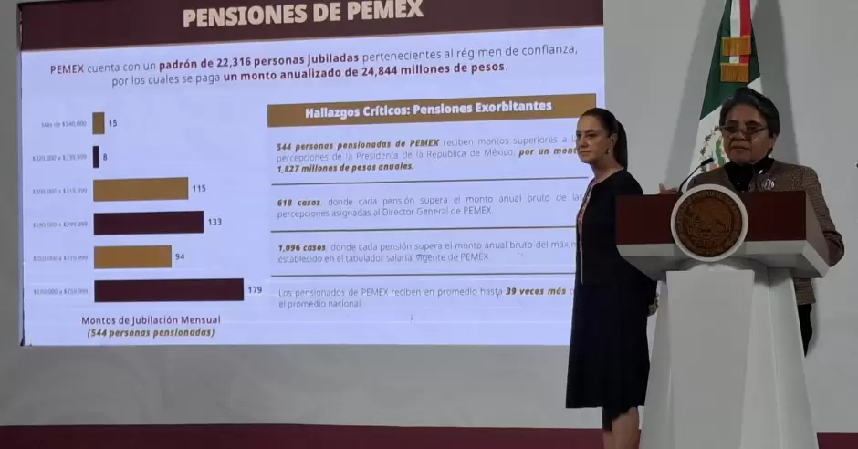 En Palacio Nacional, la titular de Anticorrupción y Buen Gobierno indicó que en el caso de Pemex hay 618 casos donde cada pensión supera el monto anual bruto de las percepciones asignadas al director general de Pemex, y en mil 096 casos donde cada pensión supera el monto anual bruto del máximo establecido en el tabulador salarial vigente de Pemex.