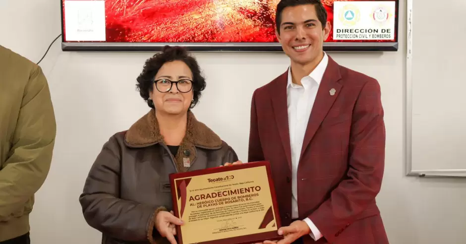 Playas de Rosarito.- Como muestra de gratitud y reconocimiento al esfuerzo solidario entre municipios, el alcalde de Tecate, Román Cota Muñoz, entregó un reconocimiento al Heroico Cuerpo de Bomberos de Playas de Rosarito por su invaluable apoyo, entrega y compromiso durante los incendios forestales registrados en 2025 en la zona serrana de Tecate.