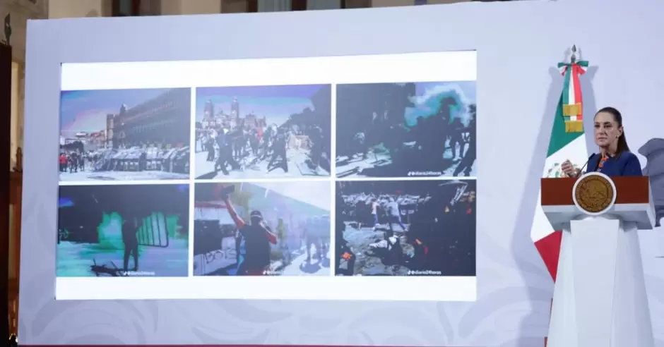 En el Salón Tesorería, la titular del Ejecutivo federal mostró imágenes de integrantes del llamado bloque negro "muy, muy violentos".
