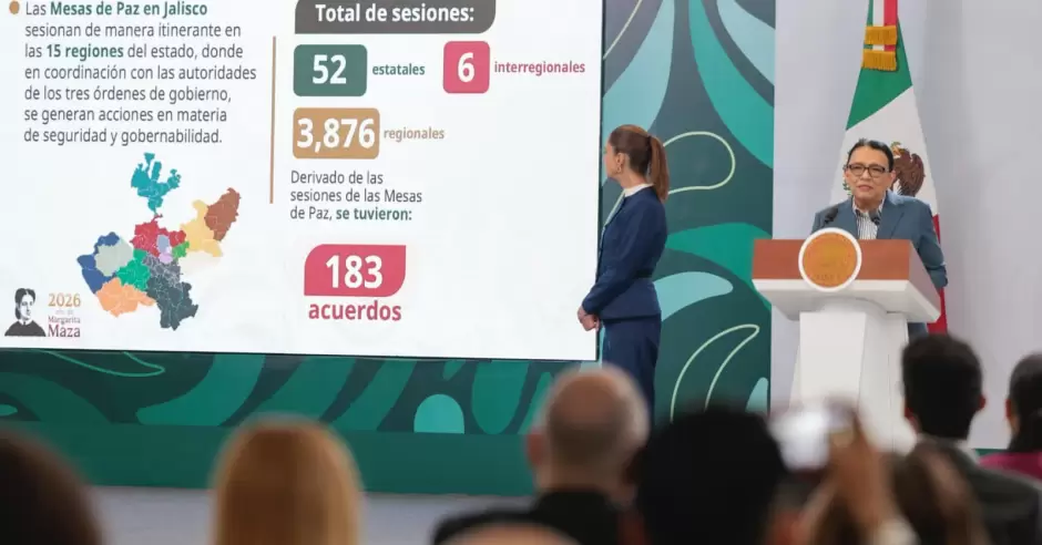 La secretaria de Gobernación, Rosa Icela Rodríguez Velázquez, explicó que, como parte del eje de Atención a las causas, en Jalisco las Mesas de Paz estatales tuvieron 52 sesiones, 3 mil 876 regionales y seis interregionales, en las que se suscribieron 183 acuerdos. En el estado se efectuaron 278 Jornadas por la Paz, en las que participaron 110 mil personas; se ofrecieron 91 mil 309 servicios y trámites; se realizaron 32 mil 806 visitas casa por casa en 33 colonias, se instalaron 29 Comités de paz, 33 Ferias de Paz y se recuperaron cinco espacios públicos. Asimismo, con Sí al Desarme, Sí a la Paz, del 1 de octubre de 2024 al 5 de marzo de 2026 en siete municipios se intercambiaron de forma voluntaria 82 armas de fuego por dinero en efectivo.