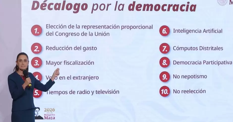 En el Salón Tesorería, presentó el "decálogo por la democracia": elección de la representación proporcional del Congreso; reducción del gasto; mayor fiscalización; voto en el extranjero; tiempos de radio y televisión; inteligencia artificial; cómputos distritales; democracia participativa; no nepotismo; y no reelección.