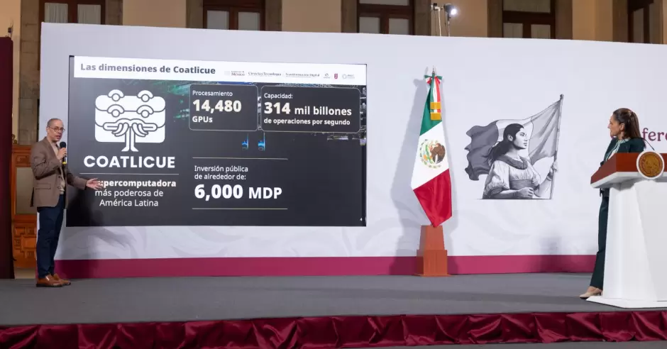 "Estamos muy entusiasmados. La supercomputadora Coatlicue, que va a iniciar su construcción el próximo año, estamos definiendo la ubicación y va a permitir que México entre de lleno al uso de la Inteligencia Artificial y procesamiento de datos que hoy no tenemos capacidad de hacerlo porque no tenemos la suficiente capacidad de cómputo, entonces nos va a ayudar muchísimo, no solo al desarrollo de la ciencia, las tecnologías, sino en esencia al desarrollo del país. Esto es Coatlicue", afirmó en la conferencia matutina: "Las mañaneras del pueblo".