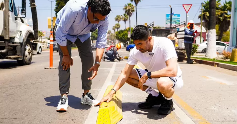 ENSENADA.- Para verificar que la instalación de delimitadores se realice conforme a lo proyectado, el alcalde Armando Ayala Robles supervisó los trabajos en la ciclovía.