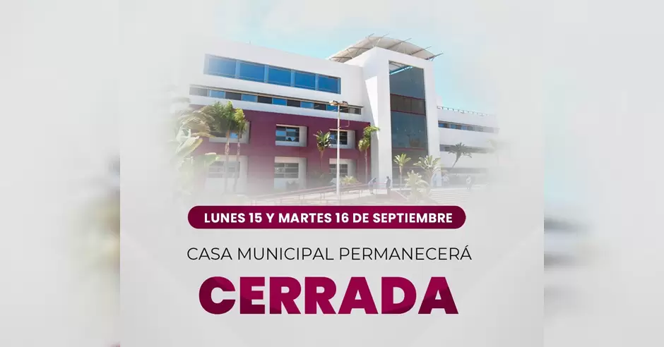 Ensenada.- Las oficinas de la Casa Municipal permanecerán cerradas los días lunes 15 y martes 16 de septiembre, informó el oficial mayor del Gobierno de Ensenada, Eleazar López Quihuis.