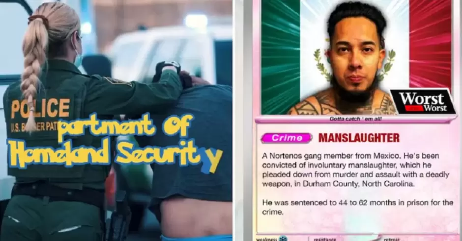 El video termina mostrando falsas cartas coleccionables de Pokémon, pero con las fichas policiales con foto de hombres y mujeres detenidos por el ICE y los presuntos delitos que cometieron, incluyendo homicidio involuntario, pedofilia, robo, asesinato y poner en peligro a menores.
