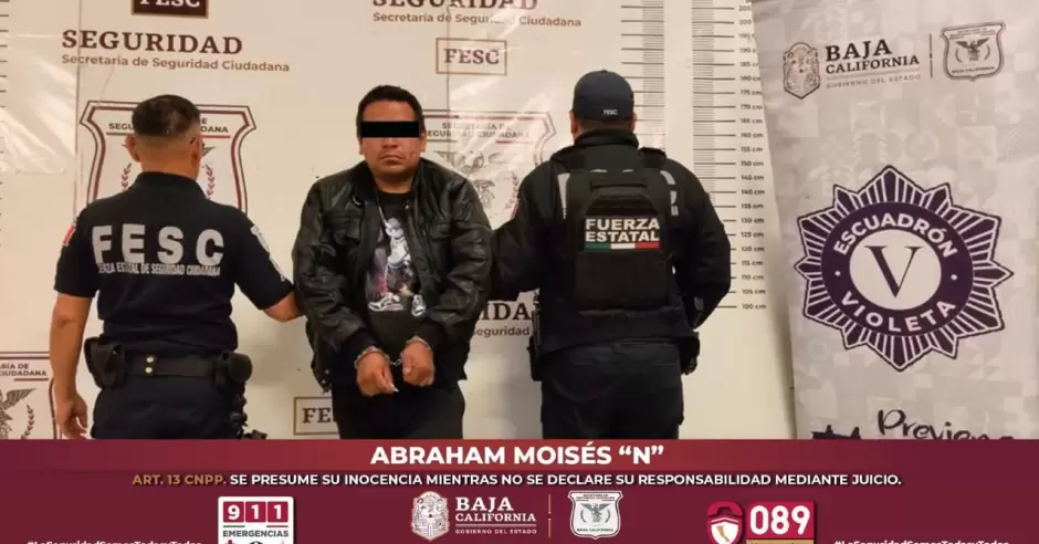 Por último, en la ciudad de Tijuana, en la colonia Las Torres, se concretó el aseguramiento de Abraham Moisés "N", de 38 años y originario de Veracruz, a partir de una denuncia ingresada en C-5 Baja California, donde se solicitaba la intervención urgente del Escuadrón Violeta para proteger a una mujer que estaba siendo golpeada por su pareja sentimental.